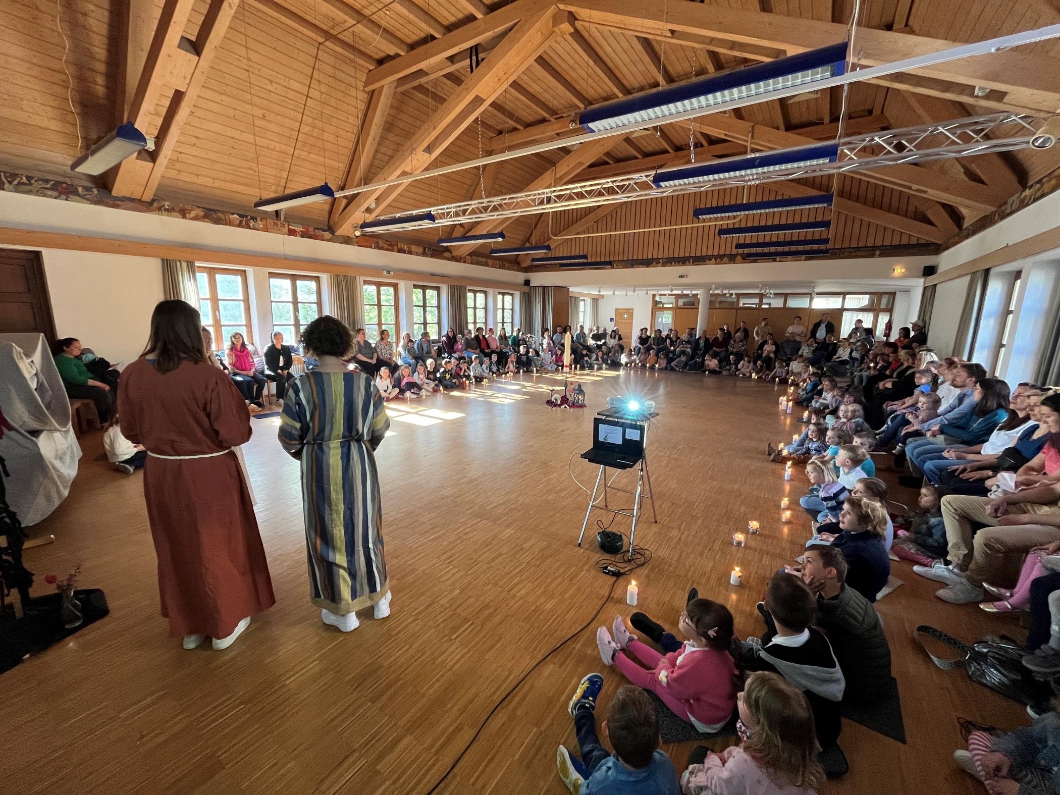 Am Karsamstag feierten die Kinder und ihre Familien bereits die Auferstehung Jesu und hörten und sahen die frohe Botschaft des Ostermorgens, als die drei Frauen zum Grab gingen und der Engel ihnen die gute Nachricht überbrachte: "Jesus lebt! Er ist auferstanden!"