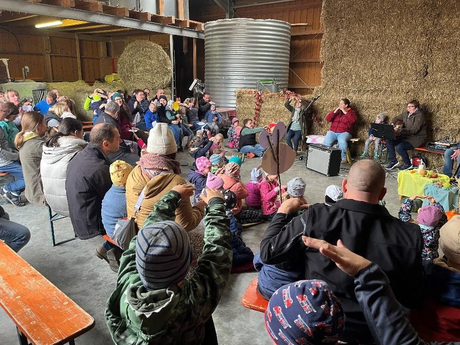 Schon zur Tradition geworden, ist die Kinderkirche im Oktober auf dem Bauernhof. Dieses Jahr hörten die Kinder und Erwachsenen die Geschichte von der Kartoffel, die sich auf die Suche nach dem Sinn ihres Daseins machte und traf dabei einen Vogel, einen Regenwurm, eine Blume, eine Hummel und einen Stein und fragte diese nach dem Sinn ihres Daseins. So hat auch jeder von uns seinen Sinn und seine Aufgabe im Leben. Der eine kann gut helfen, der andere hört gut zu und wieder ein anderer kann gut singen. Es wurde gebetet, gesungen und Gott für die Ernte des Jahres gedankt.
